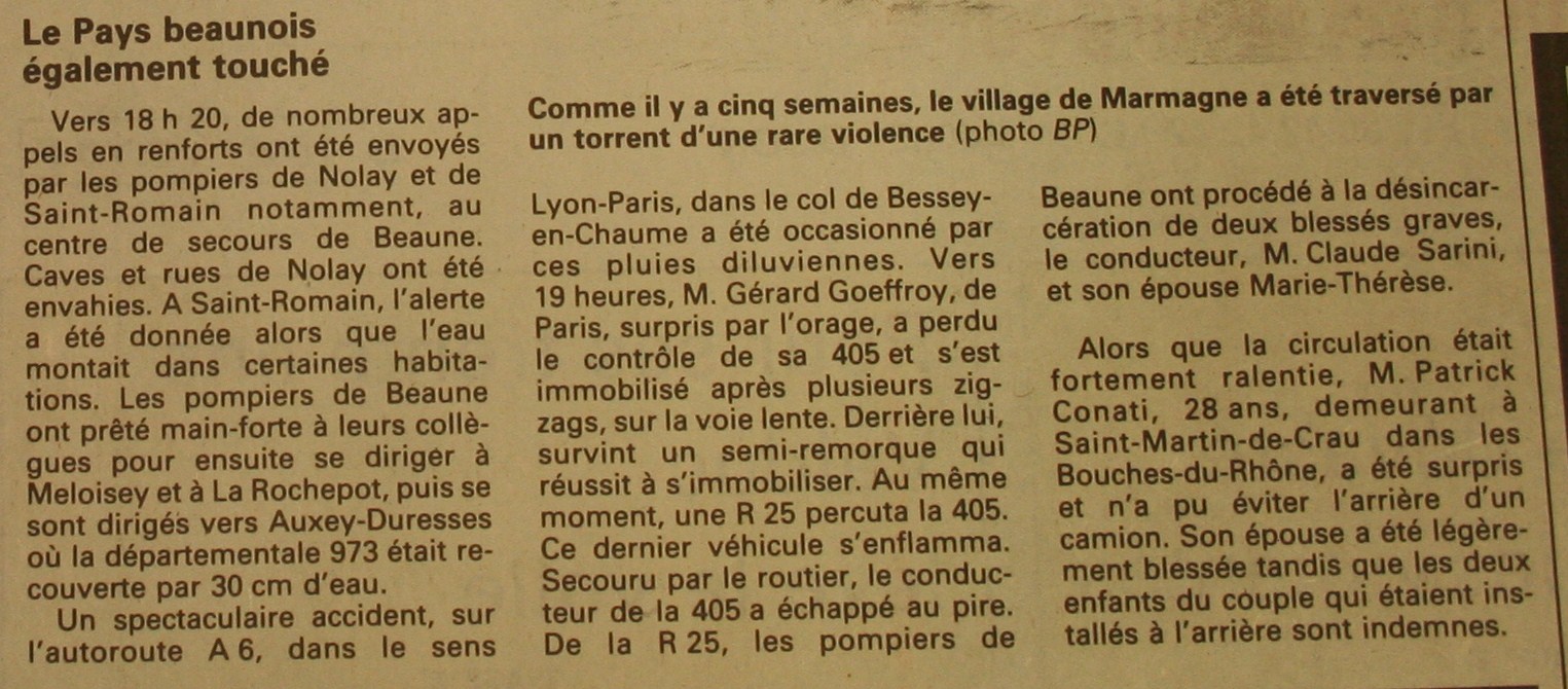 1988 16 juin 1988 Inondation par ruissellement Ruissellement Commune AUXEY-DURESSES (21), BAUBIGNY (21), LA ROCHEPOT (21), MELOISEY (21), NOLAY (21), SAINT-ROMAIN (21) modifier supprimer